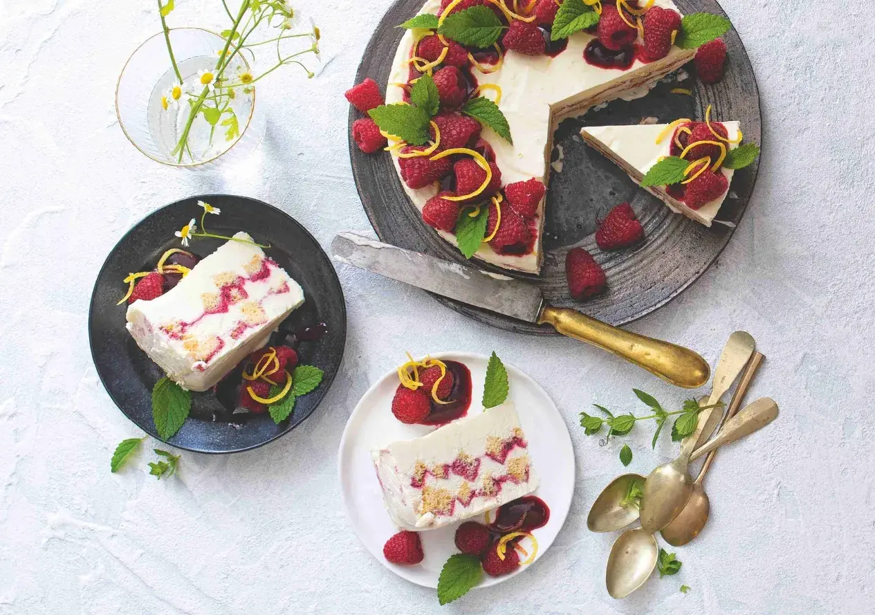 Na pohled připomíná nepečený tvarohový dort, ale chutí všechny ohromíte – zmrzlinový dort je úžasně krémový a díky citronu i osvěžující. Při přípravě dortu se obejdete bez zmrzlinovače: báječná krémová zmrzlina totiž vznikne ztuhnutím našlehaného krému v mrazáku.Ovoce můžete obměnit podle sezony a chuti, kromě malin, které jsme použili, budou skvělé i jahody, borůvky či ostružiny.
