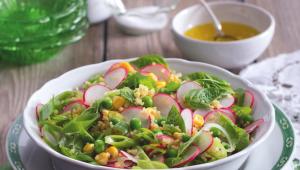 Jednoduchost salátu vyvažuje rafinovaná zálivka, ve které se spojuje razantní ocet balsamico s jemně nasládlým dezertním vínem i dva druhy olejů, každý s jinak výraznou chutí. Můžete zvolit jakoukoli kombinaci zelených lístků a bylinek, případně ji zjednodušit.
