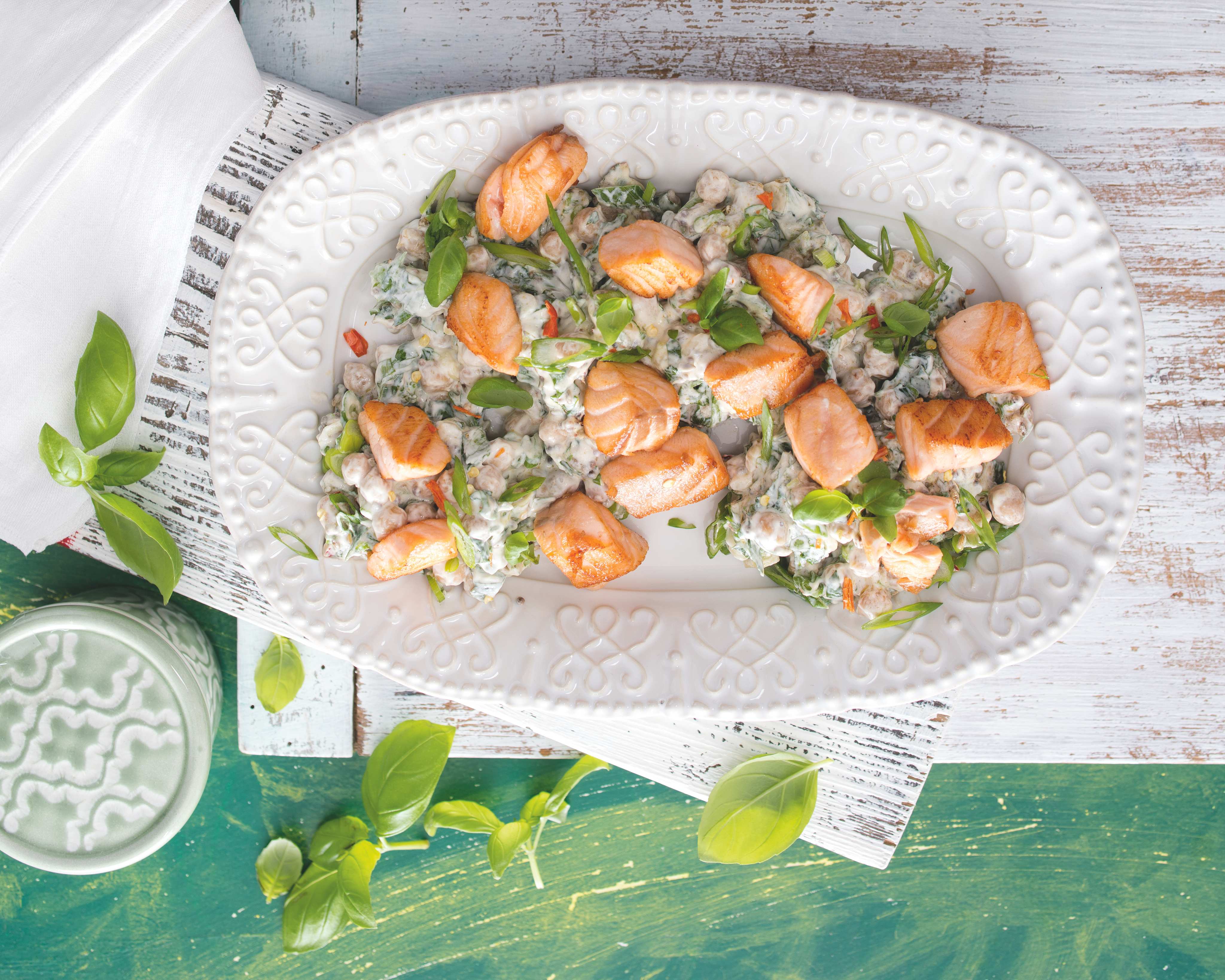 Do cizrnového salátu můžete opéct i jinou pevnou rybu (např. tresku nebo halibuta) nebo krevety.