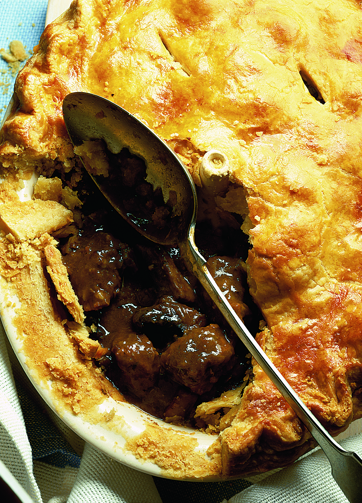 Koláč s pokličkou z křehkého těsta vypadá efektně a chutná skvěle. Dušení masa a ledvinek (úprava podobná zabijačkovému guláši) probíhá v troubě; tenhle skvělý nápad můžete příště využít i u klasického guláše. Když maso připravíte den předem a druhý den odstraníte ztuhlý tuk, bude jídlo ještě chutnější.