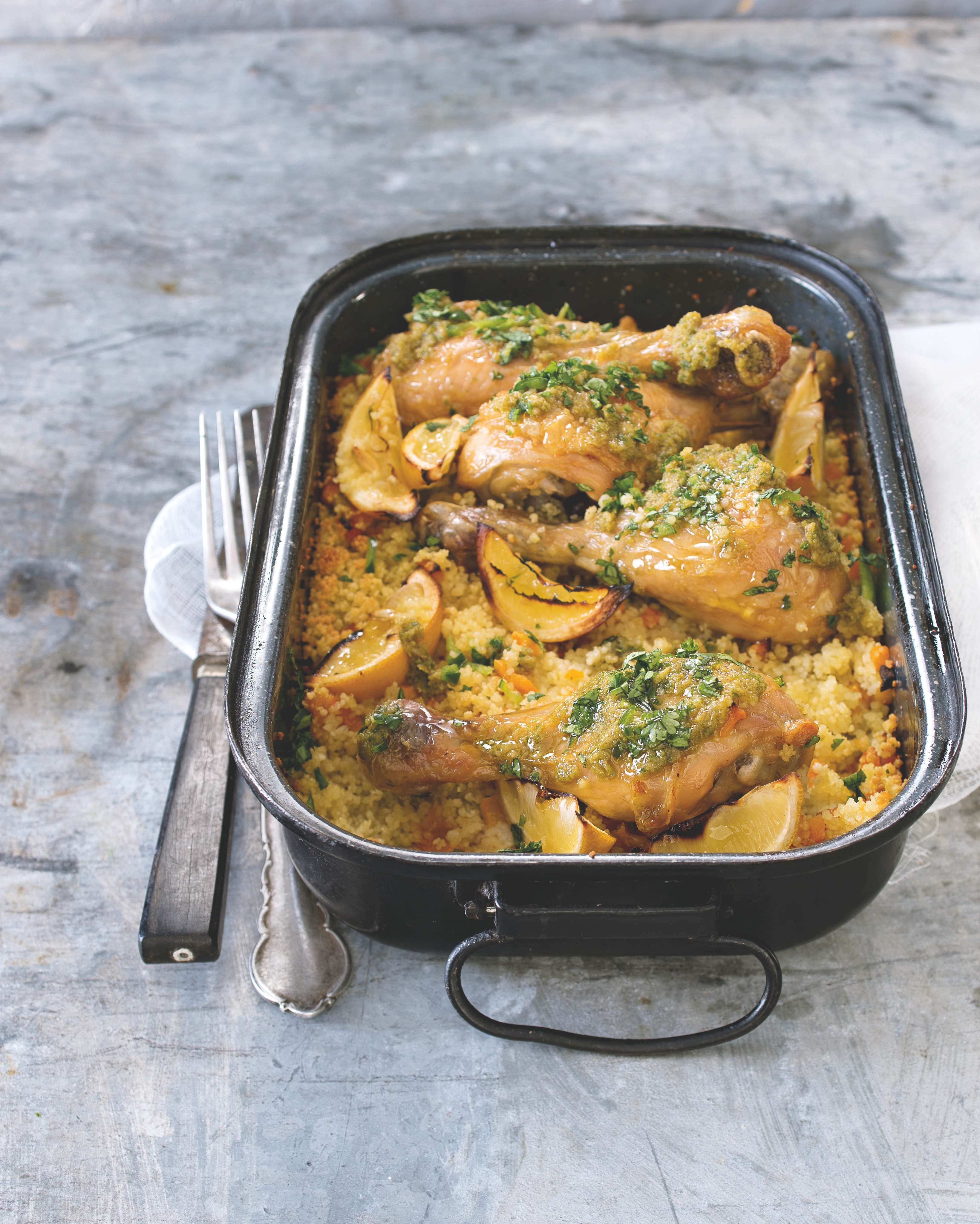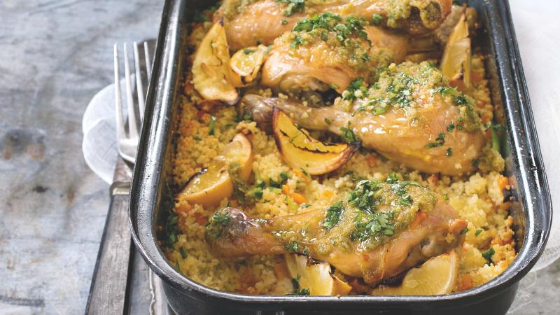 Harissa nemusí být jen červená. Vychutnejte si naši zelenou variantu. V tomhle orientálním receptu určitě oceníte i přílohu, která se dělá ve stejném pekáči jako kuře.