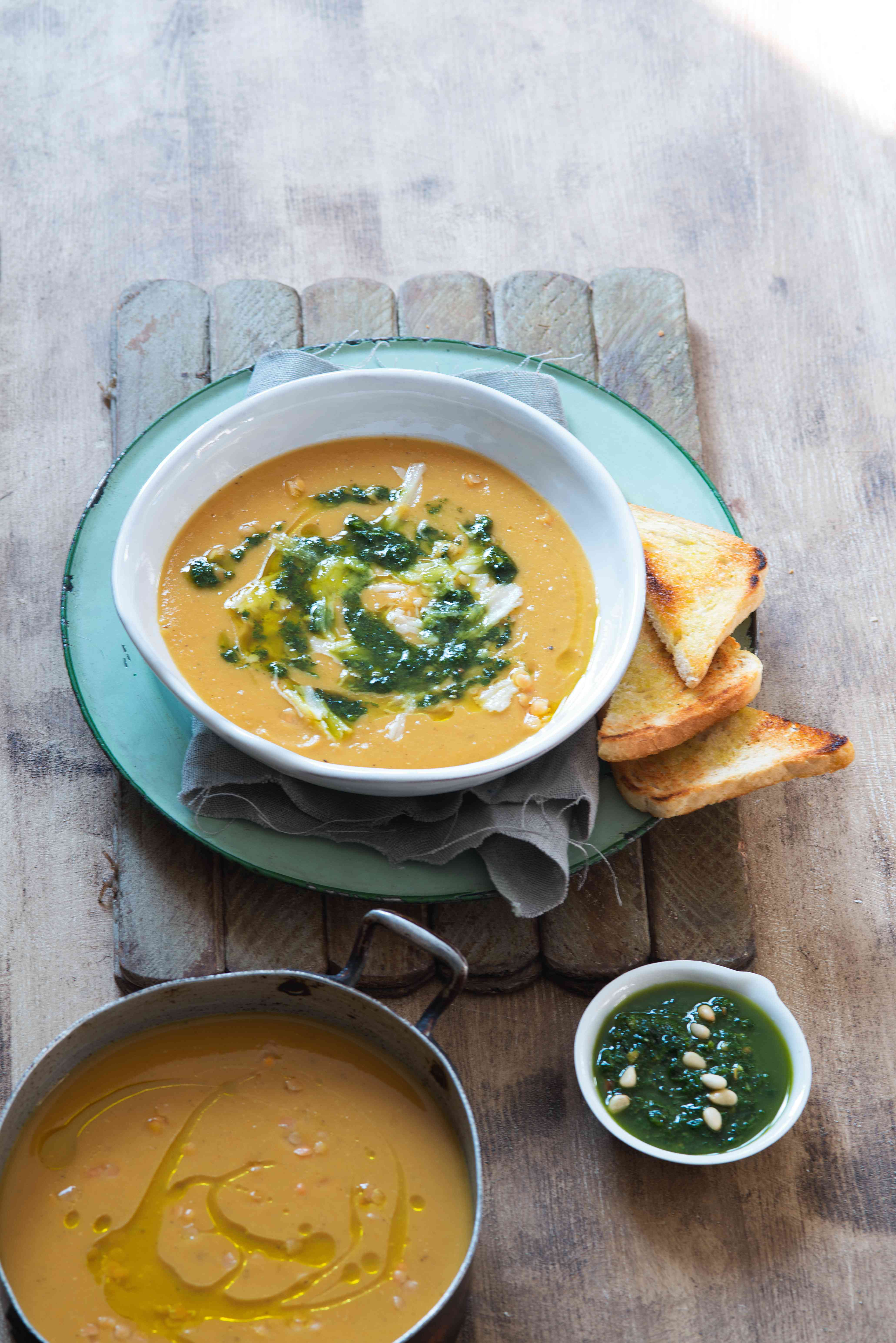 Mrkvová krémová polévka může mít řadu podob. Na jaře zkuste tuhle variantu s pestem z medvědího česneku.