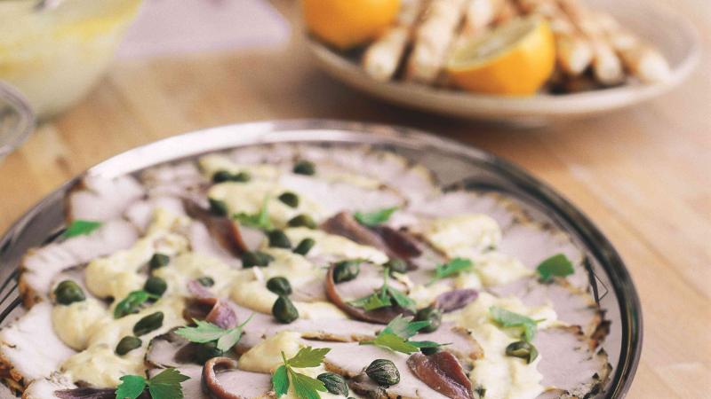 Kombinace vepřového masa, tuňáka a ančoviček – to všechno podávané na studeno – vypadá na první pohled divoce, ale výsledek je překvapivě jemný.
