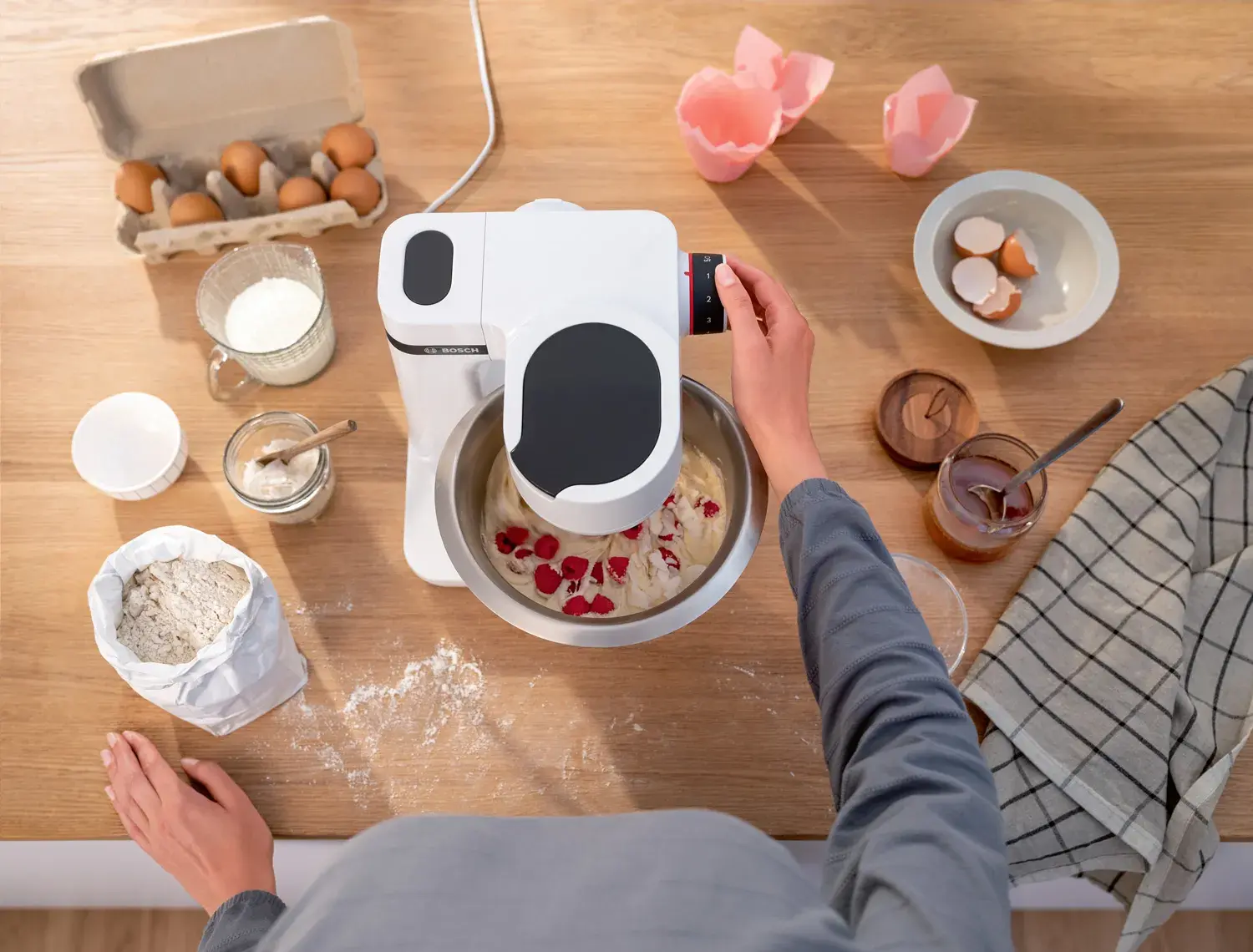 Mísa o objemu 3,8 l, která se nijak nezacvakává, přesto je stabilní a drží na svém místě. Výklopné rameno, na které můžete nasadit veškeré příslušenství, stačí je jen dát do správné polohy. O co se jedná? Kuchyňský robot z nové série MUM 2, který v kuchyni zastane spoustu funkcí od hnětení či šlehání až po mletí masa, krouhání či mixování. Zvládnete v něm tak uhníst těsto na chleba, zamíchat směs na sekanou i rozmixovat ovoce s mlékem na koktejl. Technické údaje: Robot má motor o síle 700W, nerezovou mísu o objemu 3,8l se speciálním vnitřním tvarem pro účinnou přípravu těsta (zvládne až 2,4kg piškotového nebo 1,7kg kynutého těsta) a 4 rychlostní stupně. Ve výbavě dále najdete set na hnětení a míchání (hnětací hák, šlehací a míchací metla), průběhový krouhač se 3 kotouči: oboustranný krájecí, oboustranný krouhací a strouhací středně jemný, mixér o objemu 1,25l a mlýnek na maso.