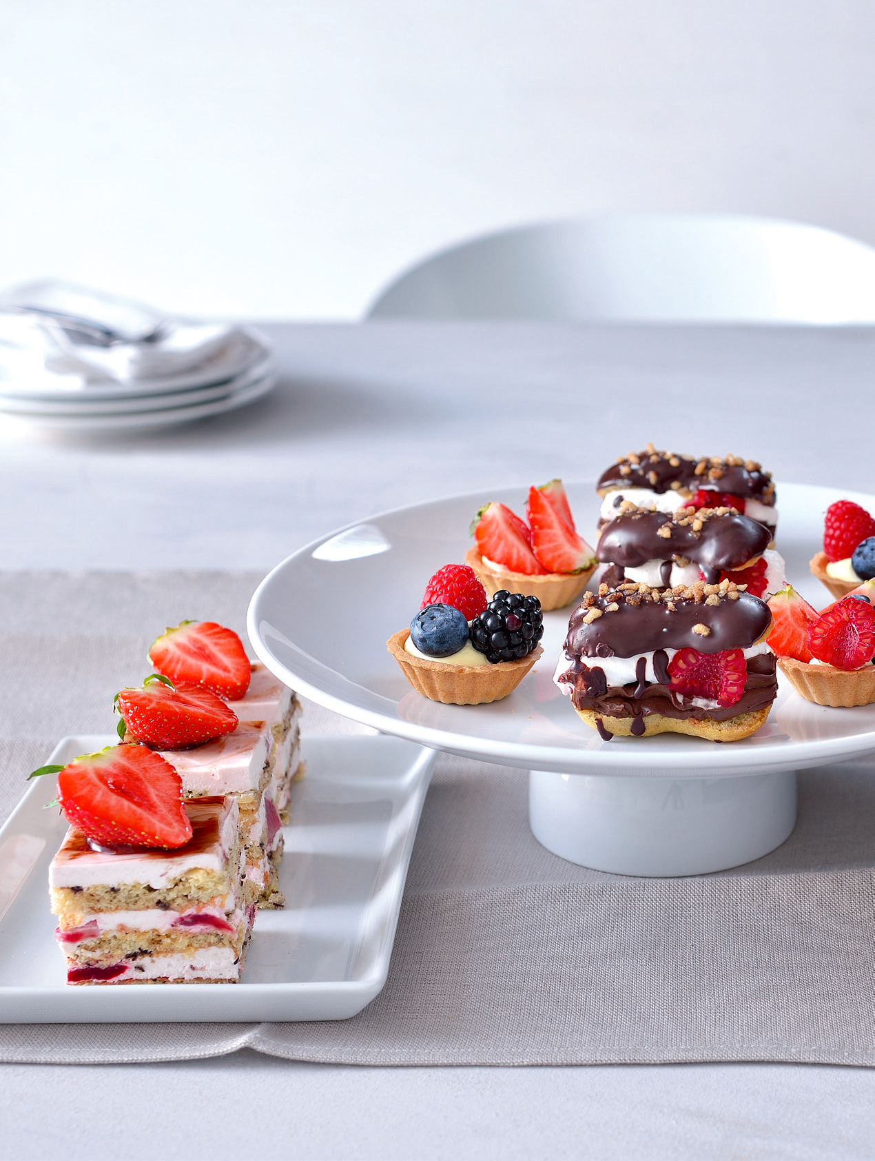 - Kombinujte kousky z odpalovaného těsta s nadýchanými řezy či minicupcaky, elegantními skleničkami, minicheesecaky, minipavlovami i oblíbenými košíčky z křehkého těsta.
