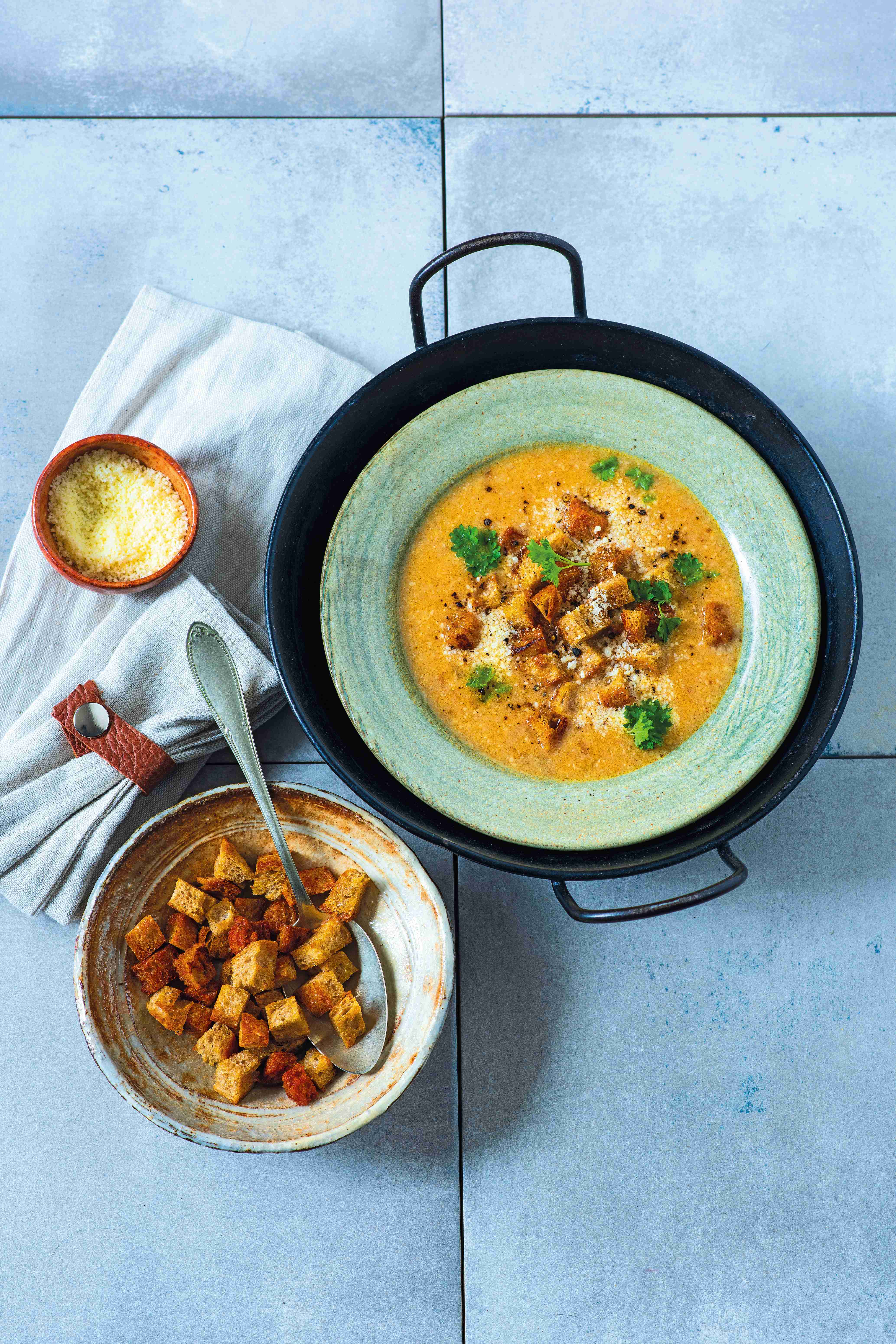 - Co byste měli mít doma? Máslo, cibuli, chleba, sladkou papriku, drcený kmín, vývar, vejce, strouhaný parmazán, sůl, čerstvě mletý pepř, hladkolistou petrželku, krutony.
