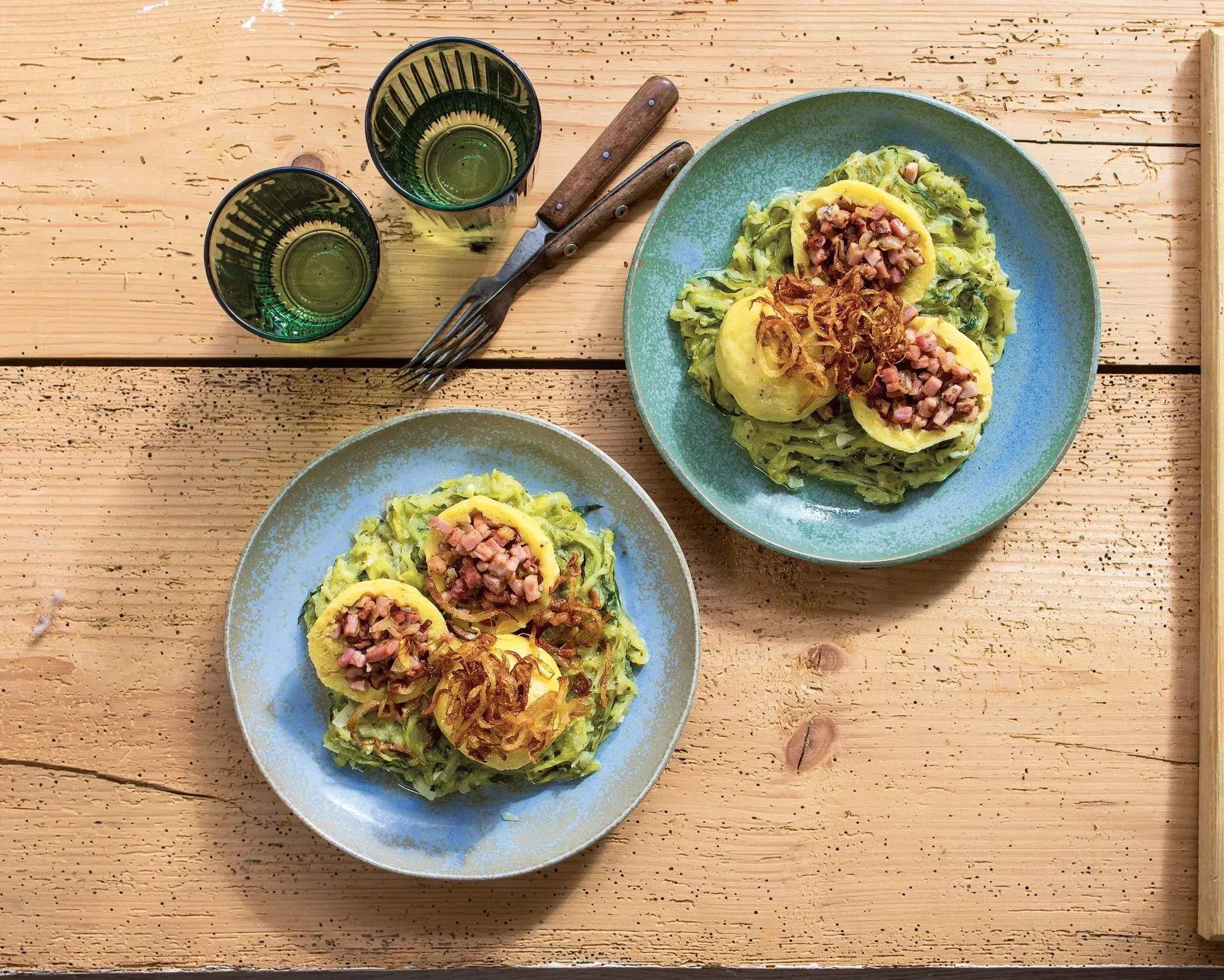 Bramborové knedlíky v jejich nejlepší formě: plněné šťavnatým uzeným, doplněné cuketovým zelím, které je lehké, svěží a s příjemně nakyslou linkou. Klasika, která dostala letní kabátek – a funguje to skvěle. Pokud jste ještě cuketu jako „zelí“ nezkusili, garantujeme vám, že tahle kombinace vás odzbrojí.