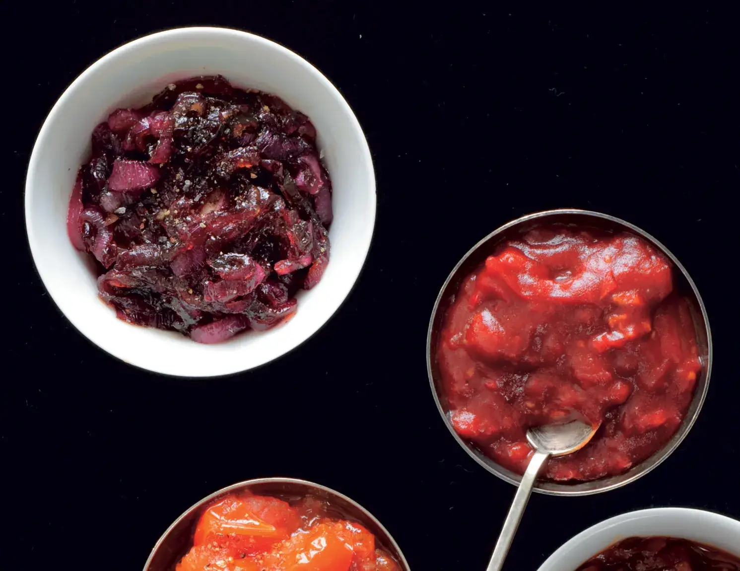 V pánvi na lžíci olivového oleje asi 15–20 minut zvolna opékejte 4 červené cibule nakrájené na plátky. Přidejte 2 lžíce sherry octa (lze nahradit směsí vinného či jablečného s balzamikovým), 2 lžíce třtinového cukru, mořskou sůl a čerstvě mletý pepř a míchejte 2–3 minuty, až směs zkaramelizuje. Nechte vychladnout. Budete mít asi 300 ml cibule, která bude výborná s masem i se sýrem halloumi.