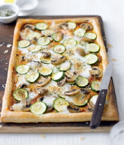 Listové těsto můžete nahradit i korpusem na pizzu. Potřete ho rajčatovou pastou, obložte zeleninou a navrch rozdrobte sýr. Místo mozzarelly můžete použít i fetu. Před podáváním pizzu zakápněte olivovým olejem.