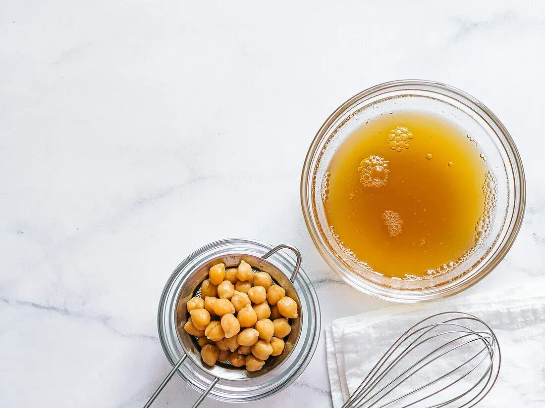 Nejjednodušší (a nejspolehlivější) způsob, jak získat aquafabu, je scedit a uchovat tekutinu z plechovky cizrny. Vybírejte tu s nízkým obsahem soli nebo bez přidané soli, aby tekutina nebyla přesolená.