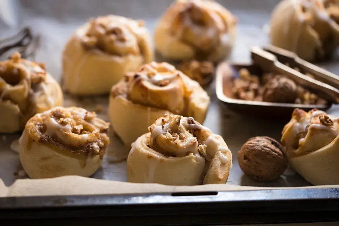 - Na ořechovou náplň si připravte mleté vlašské ořechy, bílek, cukr a trochu rumu. Těsto rozdělte na několik částí. Vyválejte první díl a vykrojte z něj trojúhelníky, které budete plnit ořechovou náplní. Trojúhelníky potřené ořechovou náplní smotejte do tvaru rohlíčků, přemístěte na plech a potřete rozšlehaným žloutkem.