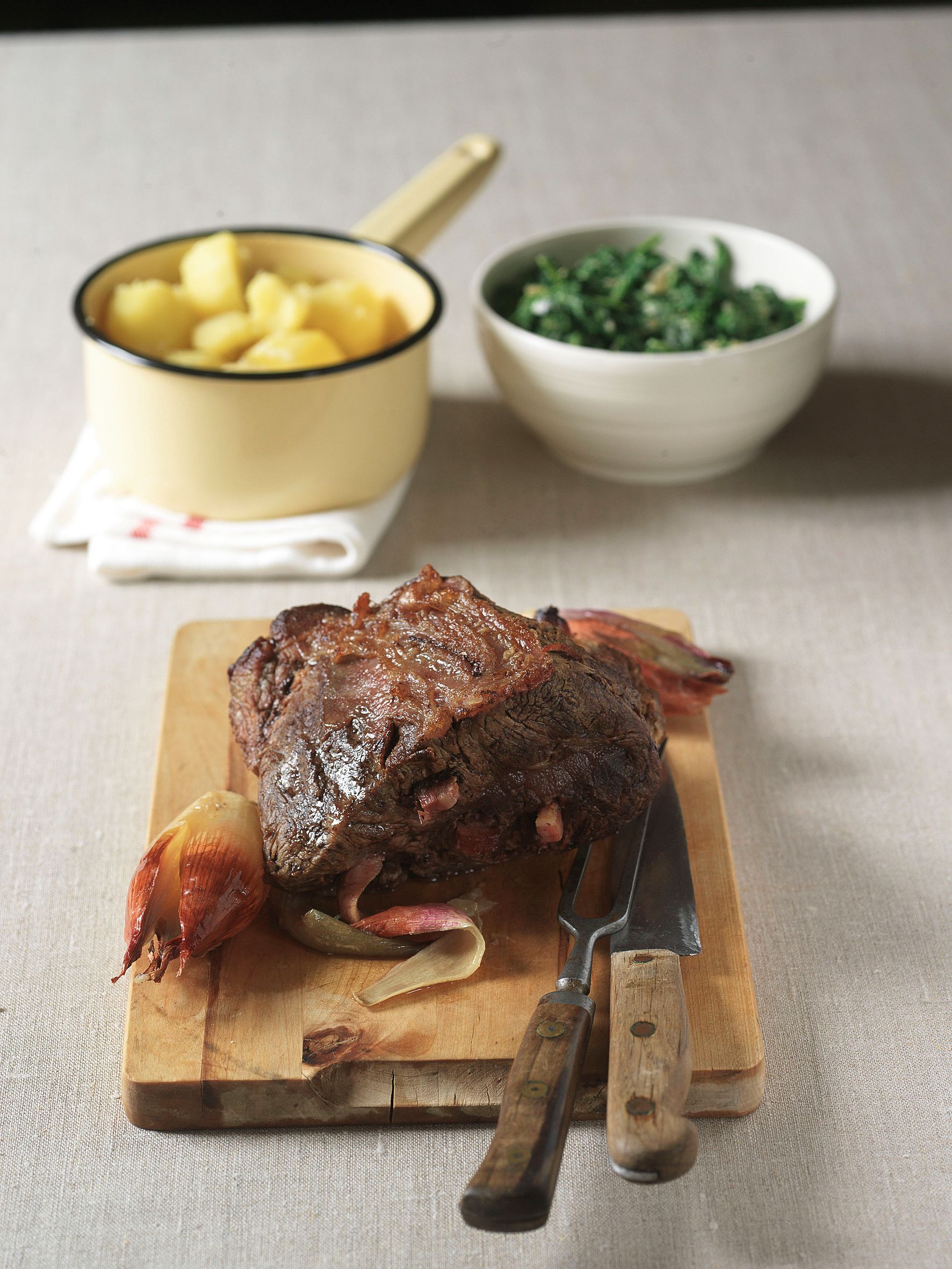 Zapomeňte na školní jídelnu. Šťavnaté hovězí se smetanovým špenátem vás dostane. Maso protkněte slaninou, osolte, opepřete a zprudka opečte na sádle ze všech stran, aby se zatáhlo. Šalotku osmahněte na sádle dozlatova, přidejte maso, zalijte vývarem a přiklopené duste asi 1,5 hodiny doměkka. Dokonalost sama!
