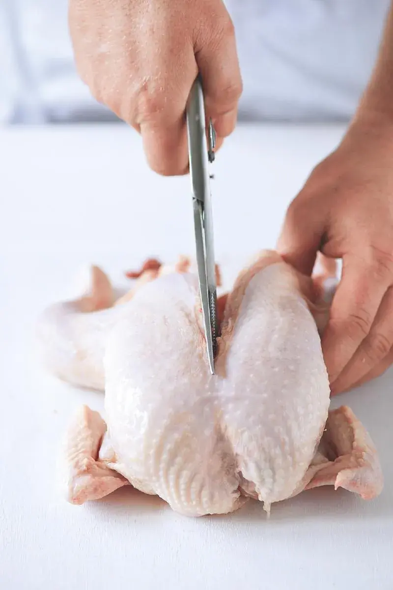 - Nejdříve odřízněte kůži zbylou po krku a z druhé strany u břišní dutiny. Pak odřízněte biskupa (pokud ho nechcete péct). Nožem, sekáčkem nebo nůžkami nakonec oddělte páteř. Všechny popsané díly (spolu s dalšími) přijdou do domácího vývaru.