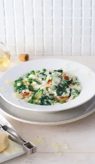 - Rizoto s hráškem. Základem receptu může být slanina, cibule, petržel, které se opékají na olivovém oleji a másle. Směs je doplněna mladým hráškem a hovězím vývarem. Krémovou chuť rizotu dodá parmazán.