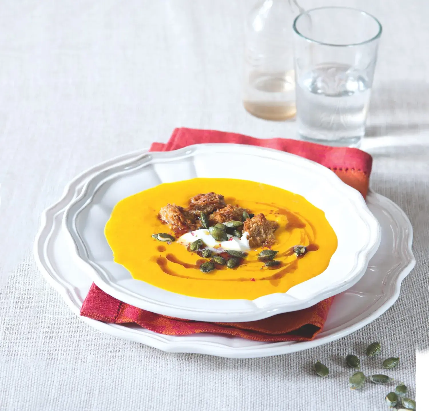Lahodná kombinace podzimní zeleniny a ovoce. Patří do ní ještě zázvor, který jí dodá lehce pikantní nádech. Jestli vás nějaká polévka zahřeje, tak tahle. Nezapomeňte ji dochutit citronovou šťávou.