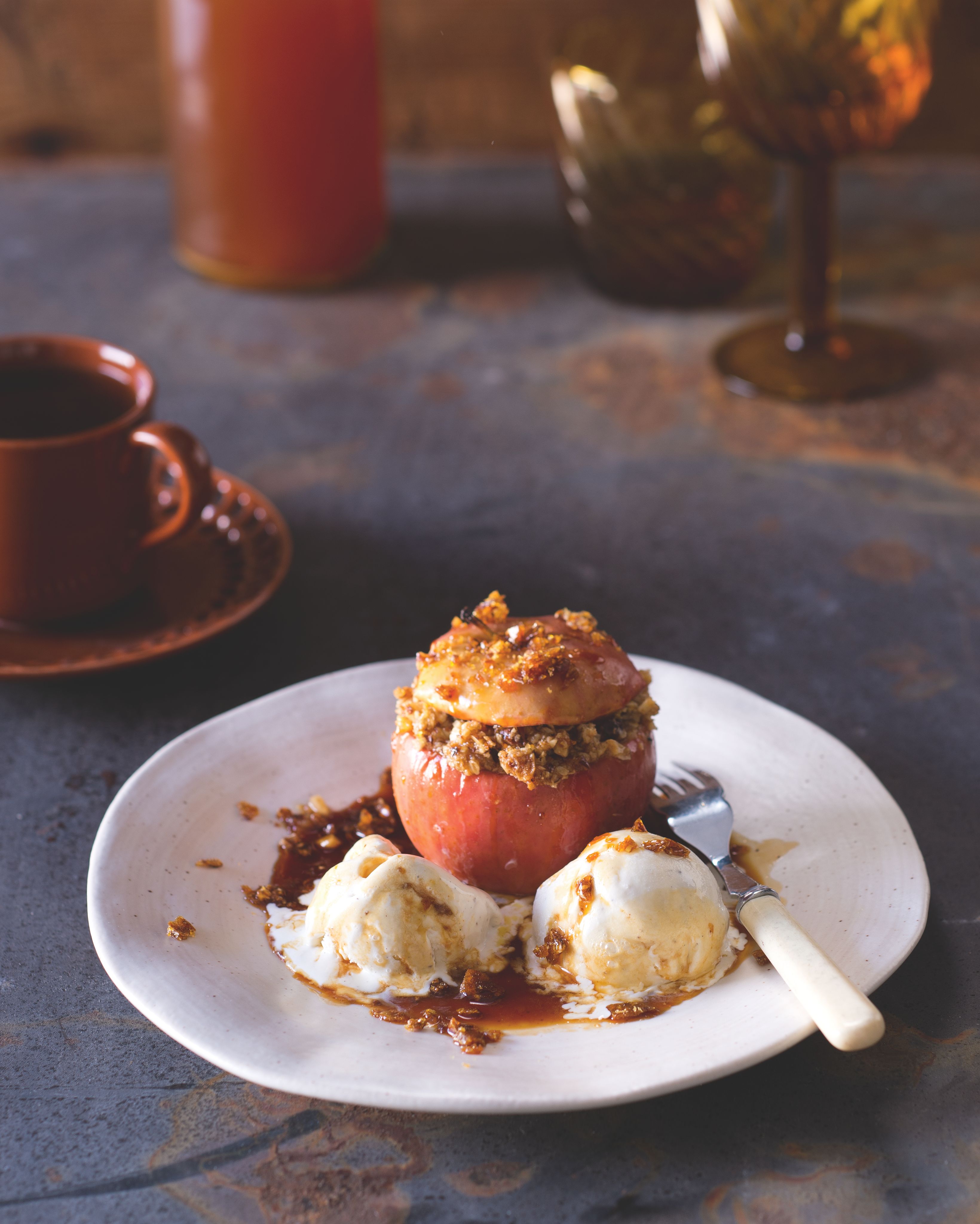 Vzhledově připomínají sopku, ze které vytéká láva v podobě smetany. Z jablek stačí vykrojit jadřinec a do otvoru nasypat rozinky se skořicí. Oříškovou drobenku budete mít hotovou raz dva. Podávat je můžete s vanilkovou zmrzlinou nebo se šlehačkou.