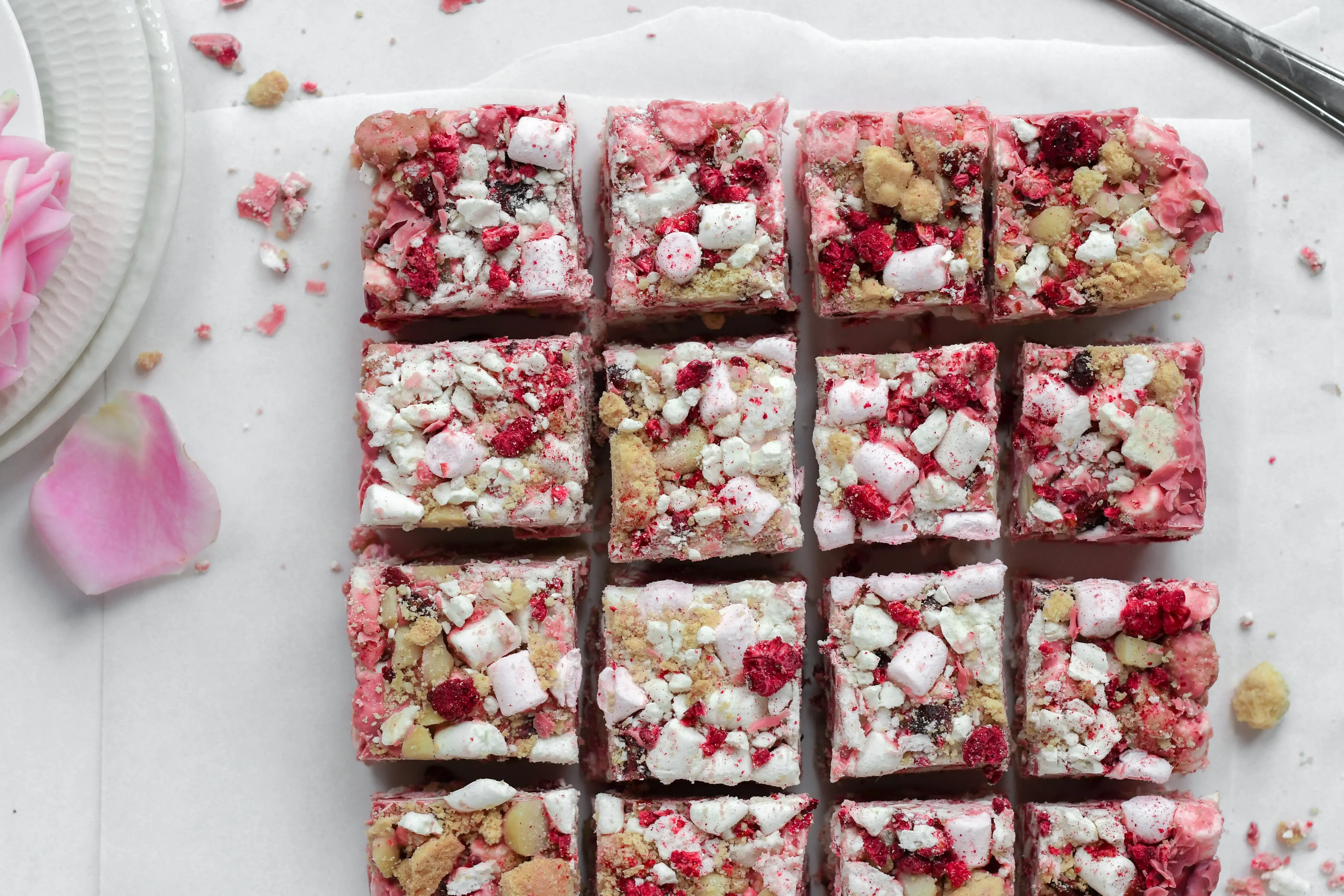 - Na „kamenitou“ část: 80 g marshmallows (ideálně mini, ale stačí nakrájet ty větší), 50 g lyofilizovaných malin nebo jahod, 50 g oříšků (mandle, pistácie nebo kešu), 50 g růžových lentilek nebo želé bonbónů