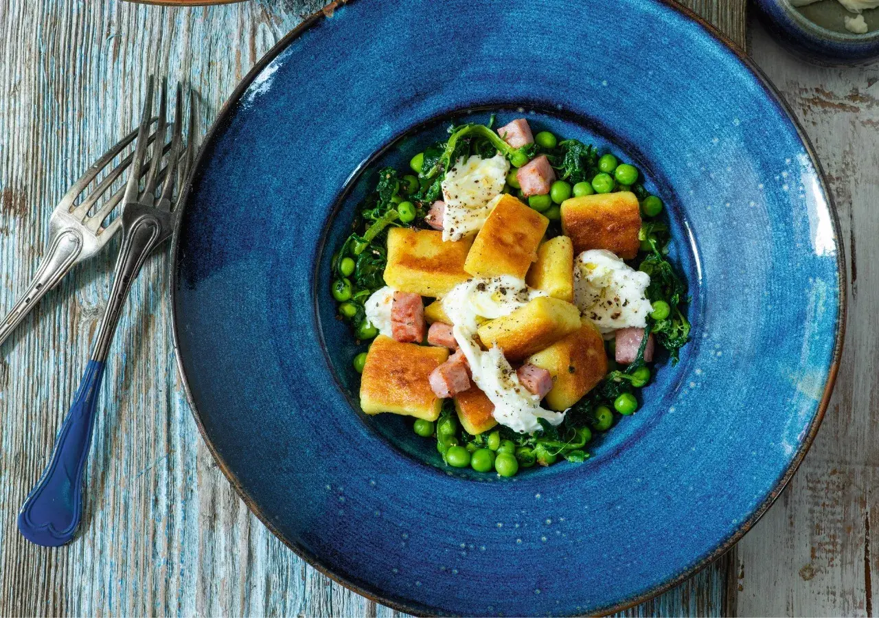 Opravdové comfort food. Křupavé noky, šunka, hrášek a máslo – jednoduchá kombinace, která chutná jako z dětství, ale v moderní a rychlé verzi. Na pánvi máte hotovo za 15 minut. Stačí sáhnout do lednice a mrazáku, improvizovat podle surovin a nechat noky krásně zezlátnout. Zeleninu můžete obměnit, šunku nahradit třeba slaninou nebo sýrem. Minimum práce, maximum chuti – přesně takhle má vypadat večeře po náročném dni.