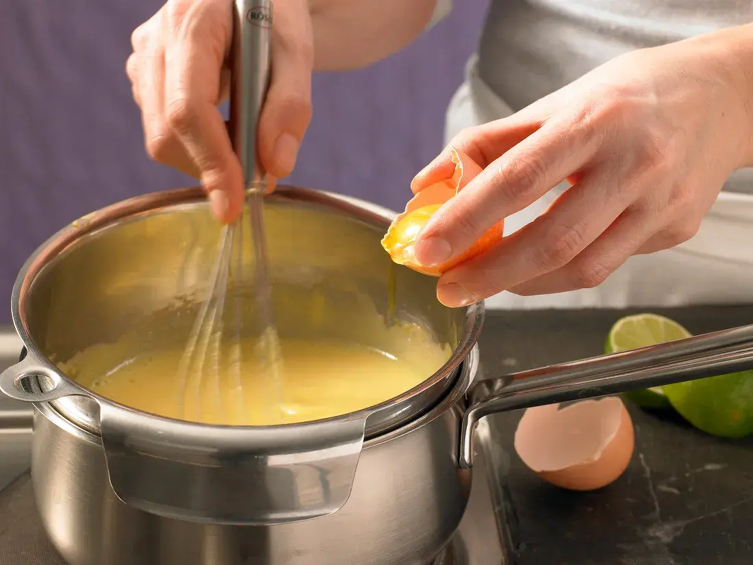 - Postavte misku nad vodní lázeň a pusťte se do šlehání ruční metličkou. Míchejte směrem od kraje ke středu. Šleháním nad vodní lázní se omáčka krásně provzdušní.