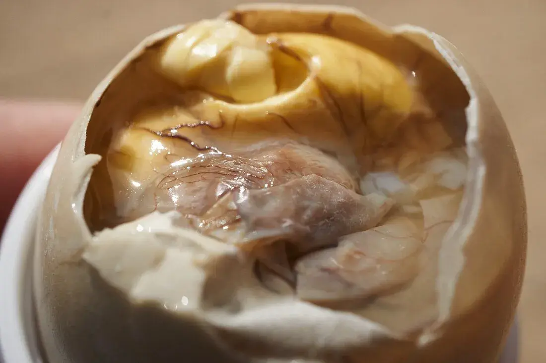 - V chuti opravdu nejde o nic nepoživatelného, roli hraje spíše psychologický efekt. Chuti k jídlu nepomáhá ani to, že po otevření skořápky spatříte skutečný zárodek mláděte s očima, zobákem i peřím. Chuťově je však považován za trochu jiné vejce natvrdo s výraznější masitou chutí.