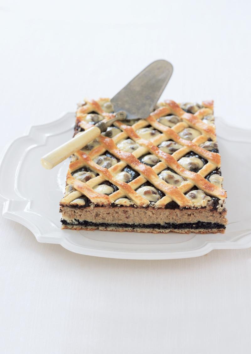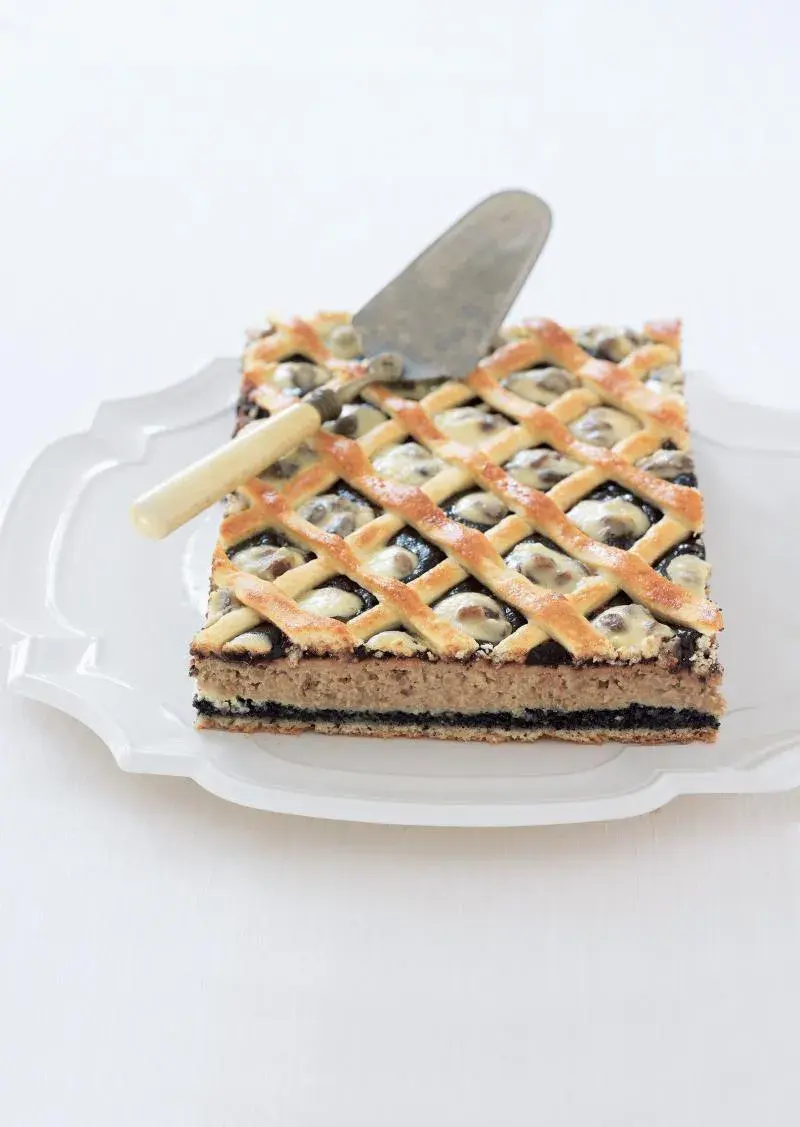 - Koláč zakončete mřížkou z proužků kynutého těsta.