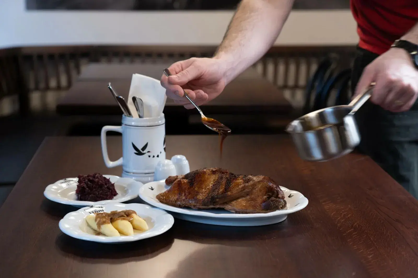 Kachna je šťavnatá, s křupavou kůží, doplněná o tradiční přílohy, jako jsou bramborové šišky a zelí. Speciality z kachny mají v nabídce významné místo, ať už jde o kachní jelítko, smažená játra, kaldoun, nebo kachní sekanou.
