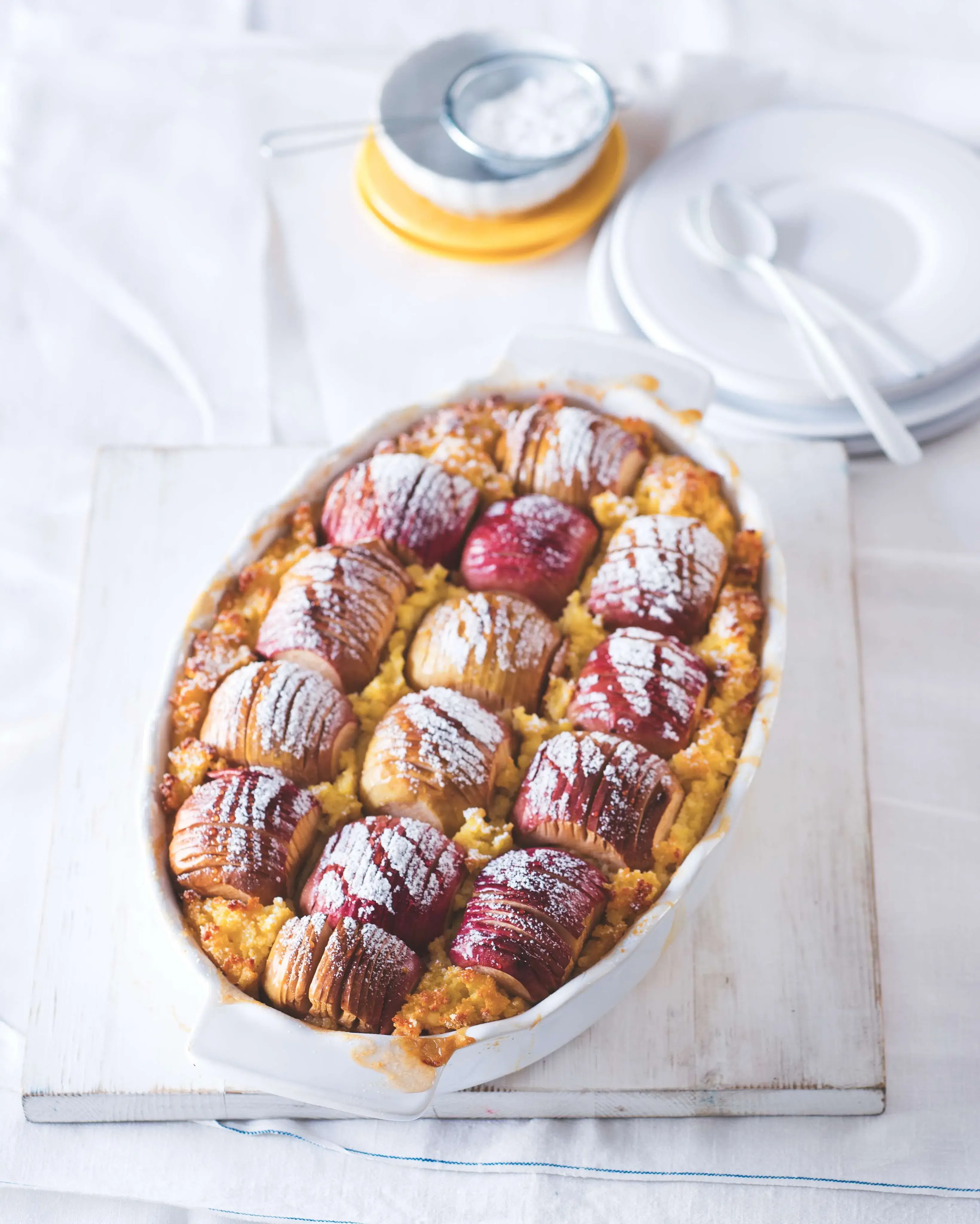 Suroviny (4–6 porcí): 250 g jáhel, 500 ml mléka (může být i ovesné nebo mandlové), špetka soli, 4 vejce (žloutky a bílky zvlášť), 90 g krupicového cukru, máslo (na vymazání + na pokladení), strouhanka (na vysypání formy), hrušková povidla (na potření), 7 menších jablek, moučkový cukr (na posypání), med nebo sirup (na zakápnutí)