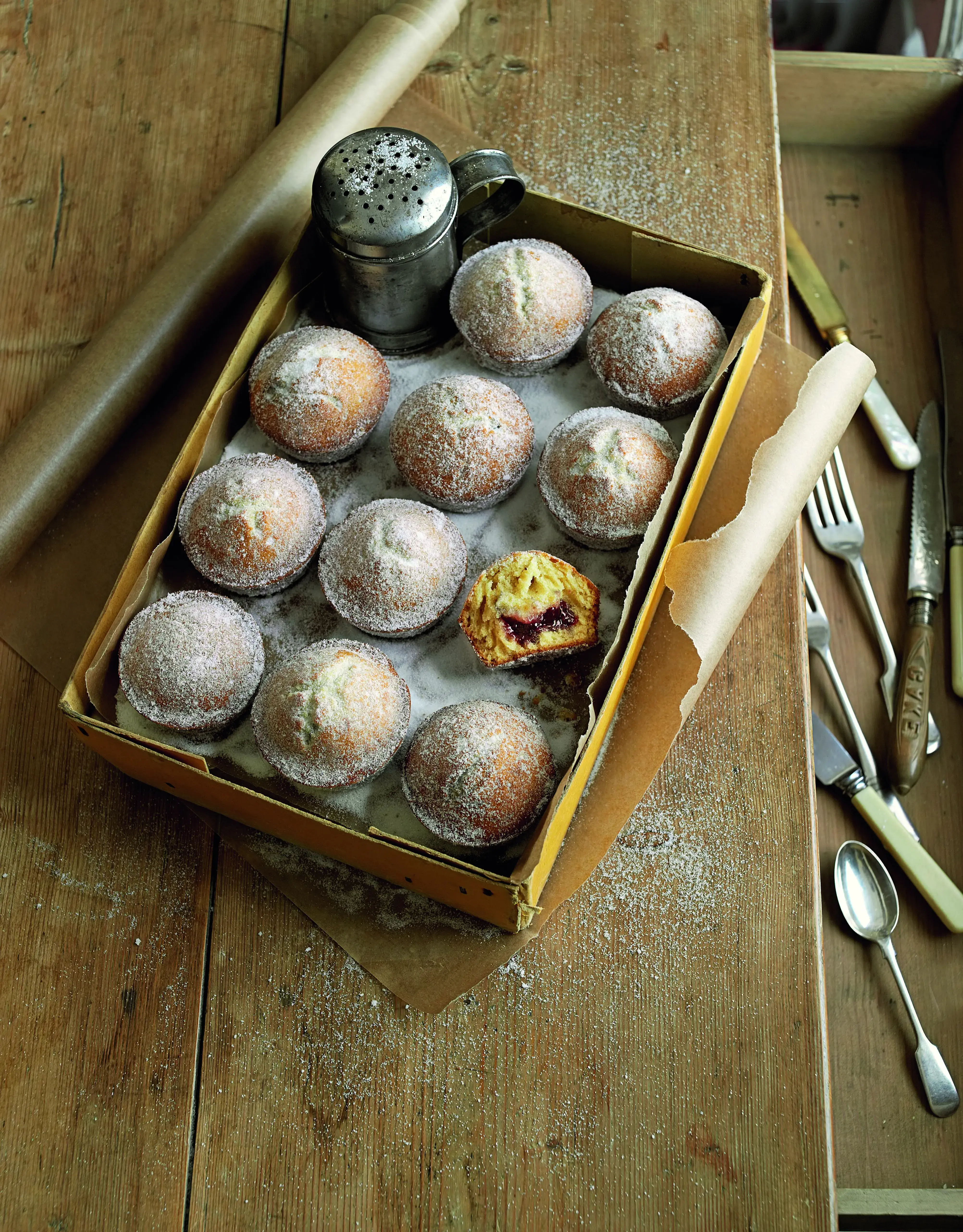 Ingredience: 140 g másla, rozpuštěného + na vymazání formy, 140 g třtinového cukru, 200 g hladké mouky, 100 ml bílého jogurtu, 2 velká vejce, 12 lžiček malinového džemu, 1 lžička vanilkového extraktu, 1 lžička jedlé sody, 200 g jemného krupicového cukru na obalení
