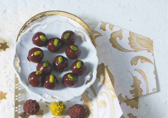 TIP: Pokud nemáte rádi nugát, tvarujte kuličky přímo z pistáciovo-mandlové hmoty, obalte je v drcených pistáciích, mandlích či kakaových bobech smíchaných s kakaem holandského typu.