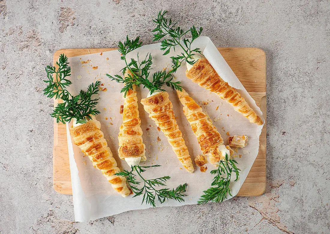 Mrkvičky z listového těsta plněné vajíčkovou pomazánkou jsou skvělým velikonočním občerstvením pro koledníky. Budete na ně potřebovat kornouty z alobalu, které hravě zvládnete vyrobit doma.