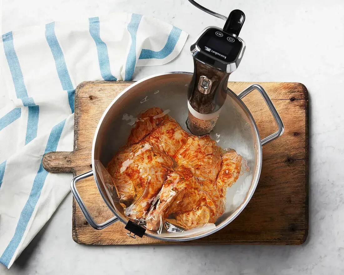 - Čas je při vaření sous vide na vaší straně, máloco lze přetáhnout. Necháte-li maso ve vodě hodinu nebo tři, je vlastně skoro jedno. Proto většina receptů uvádí minimální a maximální čas (v našem receptu je to minimálně 1 hodina, maximálně 4).