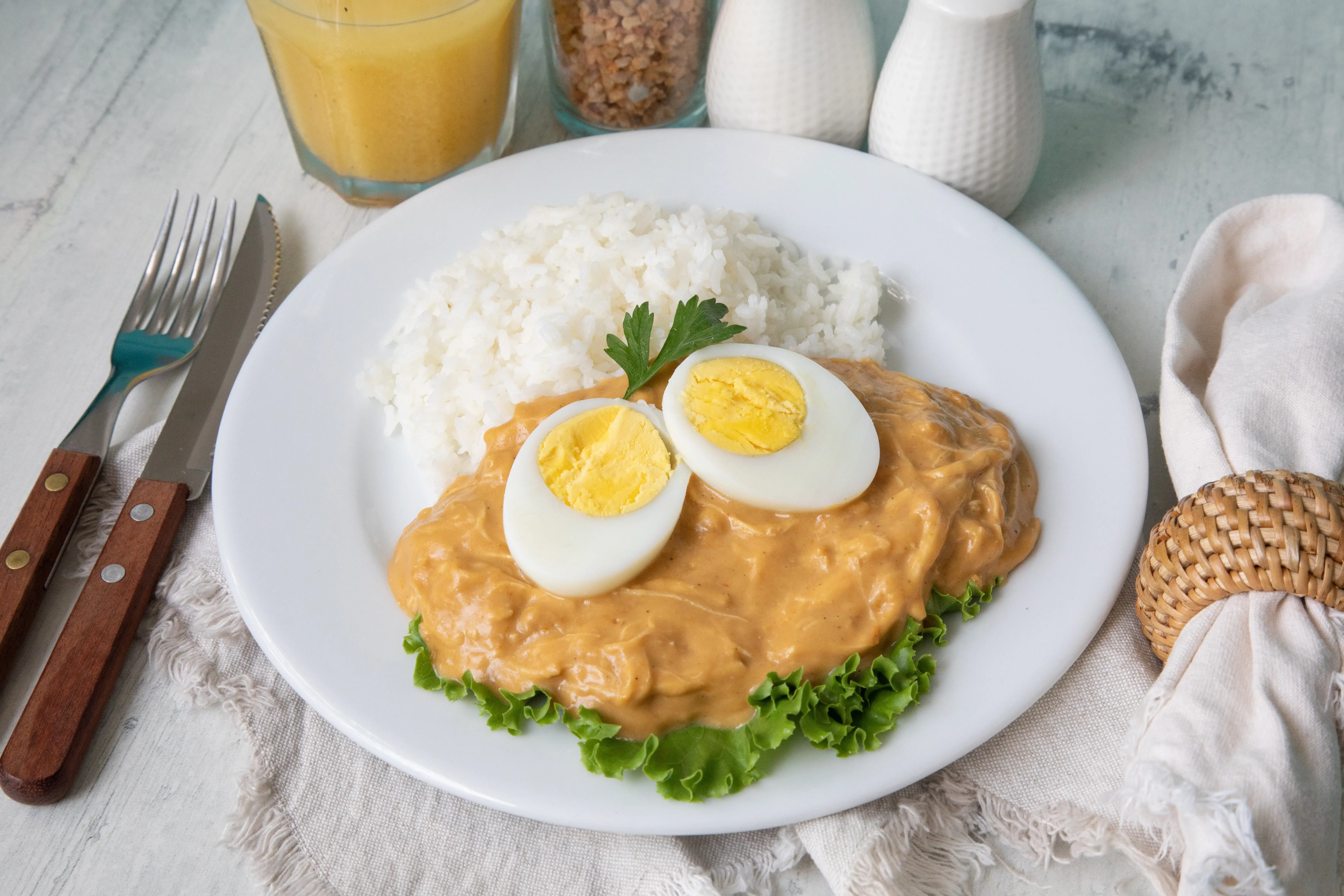 Suroviny: 1 kuřecí prso (uvařené a natrhané na vlákna), 1 cibule (najemno nakrájená, bílá nebo červená), 100 g strouhaného parmazánu, 4 papričky ají amarillo (nebo jiná sladká paprika), 4 plátky bílého pečiva (zvlhčeného vývarem), 4 stroužky česneku, špetka mletého černého pepře a římského kmínu, 30 g vlašských nebo pekanových ořechů (jemně nasekaných), 50 ml zahuštěného mléka (evaporated milk), 2 vařená vejce, 4 brambory, 2 hrnky rýže (neuvařené, k podávání), 4 lístky salátu, 4 olivy Kalamata, 1 lžíce rostlinného oleje, sůl podle chuti