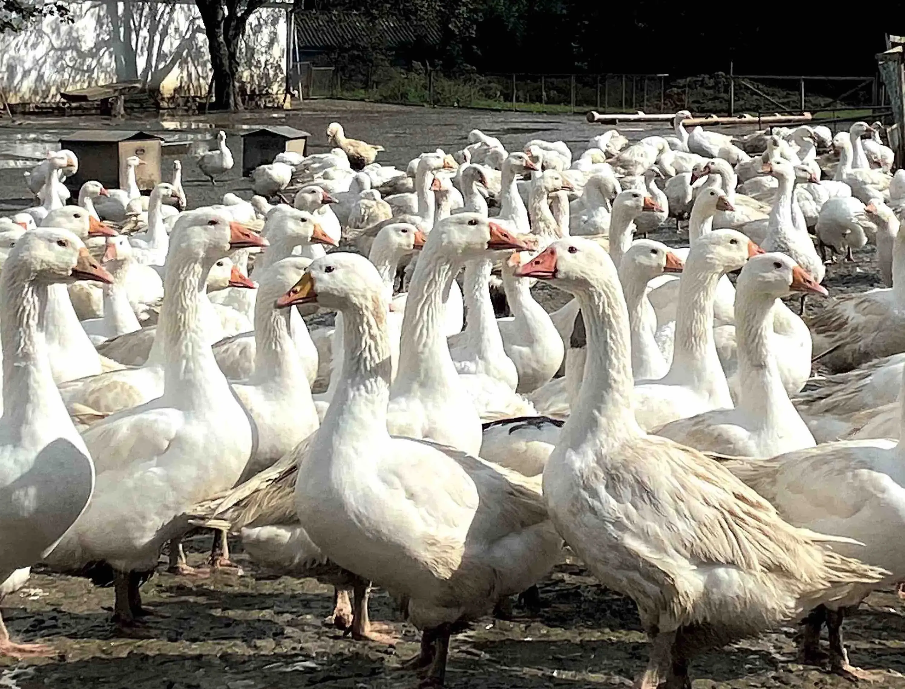 „My jsme tu se švagrovou byli zaměstnaní a farmu jsme odkoupili,“ vypráví majitel farmy Josef Tříska, zatímco nás za hlasitého kejhání zvědavě pozoruje zhruba tisícihlavý houf. „Staří Římané prý husy používali k hlídání majetku, protože když je něco vyruší, začnou dělat rámus,“ směje se jejich chovatel. „A když vás štípne nebo praští křídlem, máte slušnou modřinu,“ přidává zkušenosti z praxe.