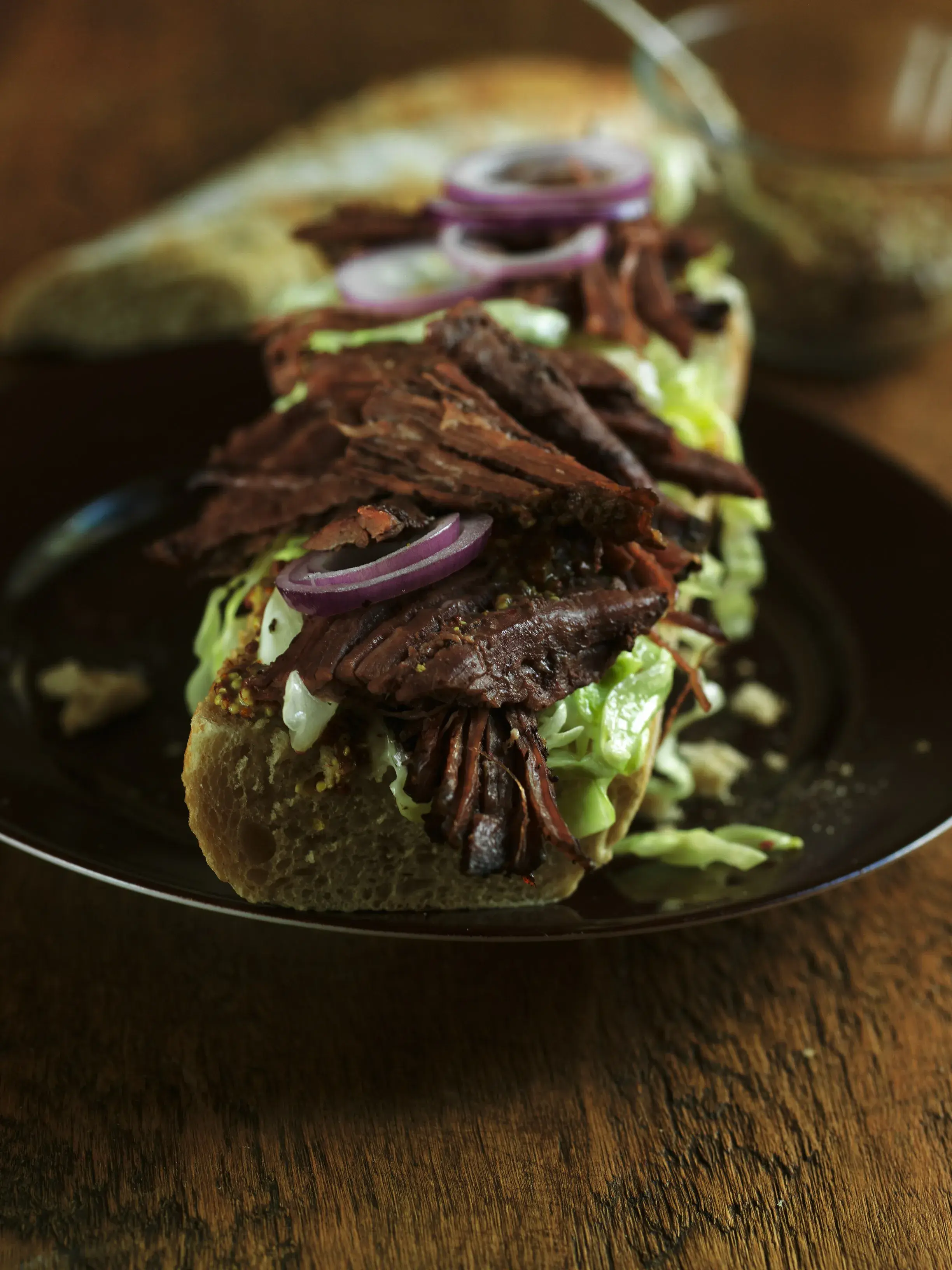 - Hovězí maso rovnoměrně rozložte na bagety, přidejte pečené papriky a zbytek sosu. Dobrou chuť!