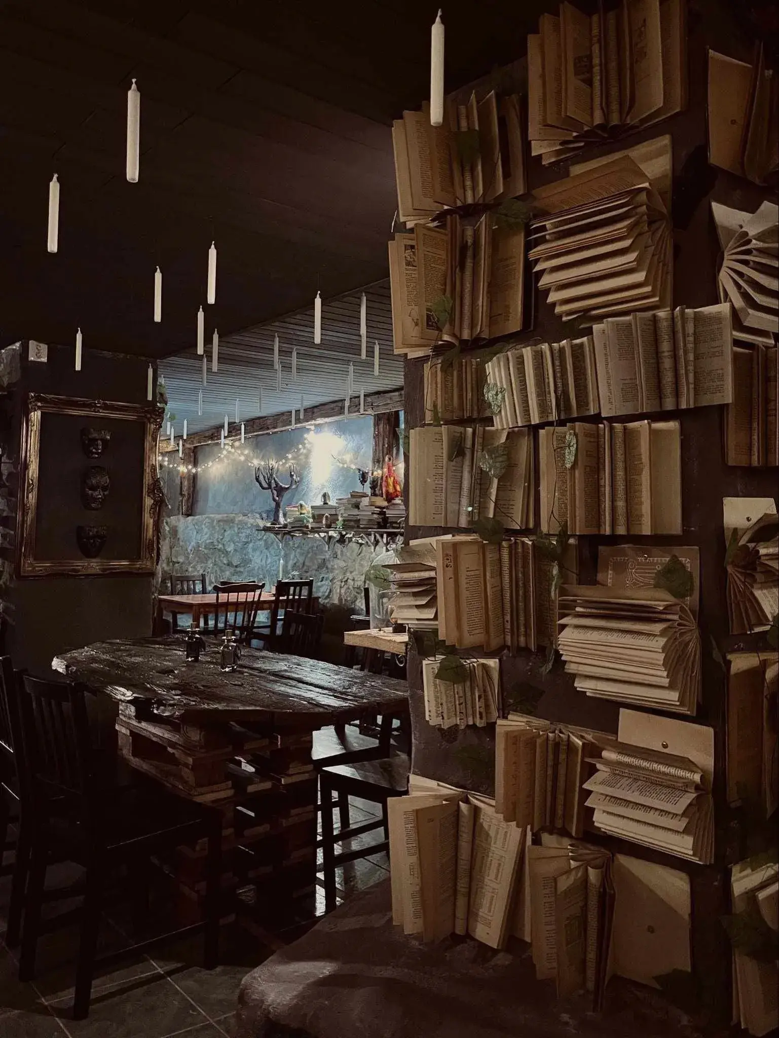 Prostor je hojně zdoben knihami a ze stropu visí desítky svíček jako v bradavické Velké síni.