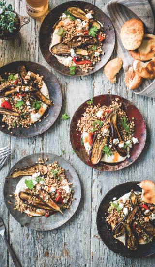 - Máte-li rádi chuť orientu, dopřejte si středomořské mezze s ožehnutými lilky, kde můžete kuskus z receptu nahradit tarhoňou.