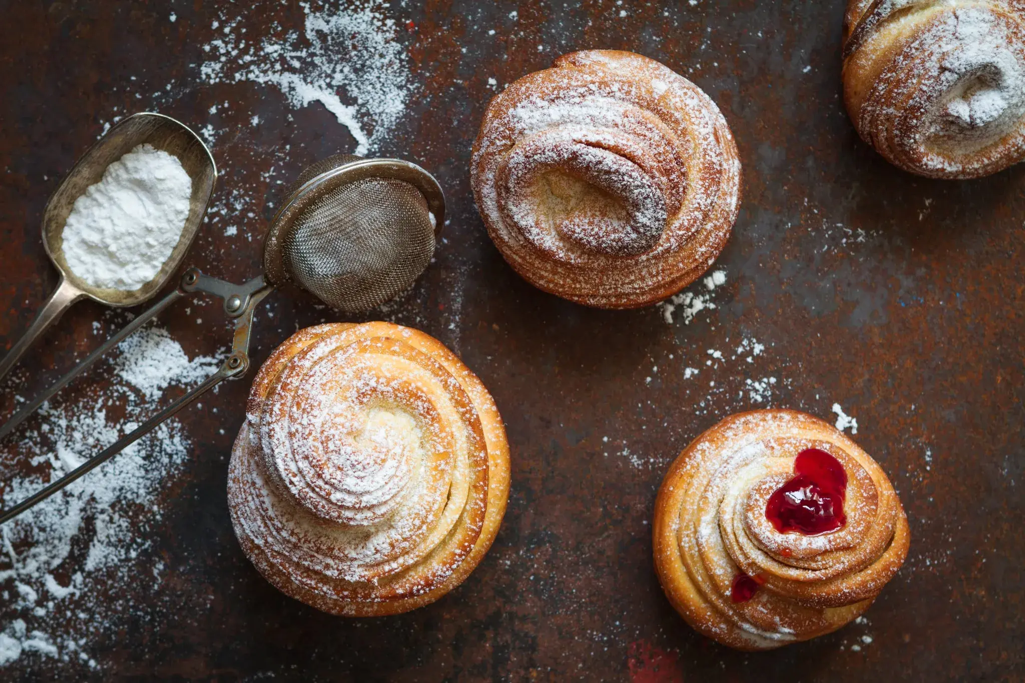 Pokud jste někdy snili o tom, že by se máslový croissant vešel do formičky na muffiny, máme pro vás dobrou zprávu. Cruffin je vrstvené croissantové těsto, zatočené do spirály a pečené ve tvaru muffinu. Výsledkem je křupavý, lehce listující dezert, který se dá plnit čokoládou, karamelem nebo vanilkovým krémem. A když se ještě pocukruje nebo přelije polevou, zbývá už jen jediné – sníst ho co nejrychleji!