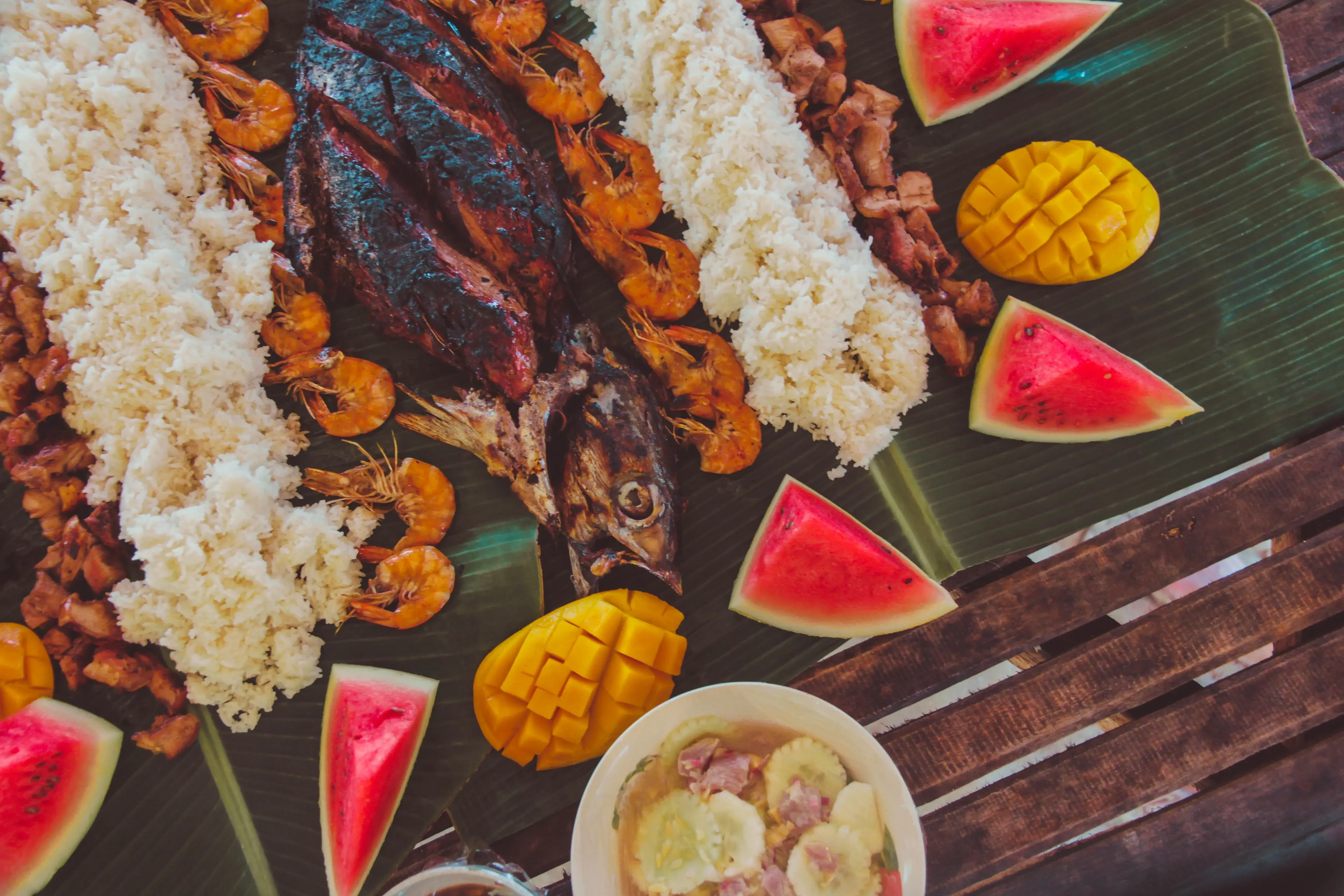 - Pokrmy zahrnují hlavně grilované maso, ryby, mořské plody, podávané se smaženými nudlemi, rýží, sladkými bramborami camote, chlebem či zeleninou.