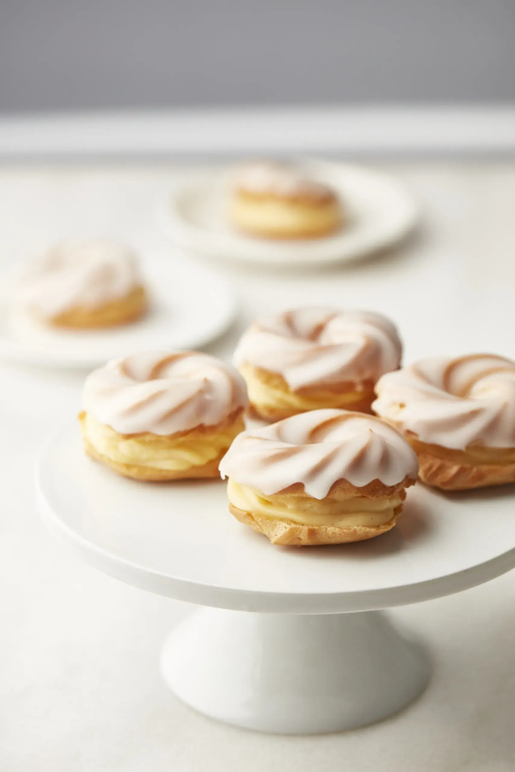 - Věnečky vodorovně rozřízněte napůl a vrchní polovinu namočte do fondánu. Na spodní část nastříkejte žloutkový krém a přiklopte vrchní půlkou.