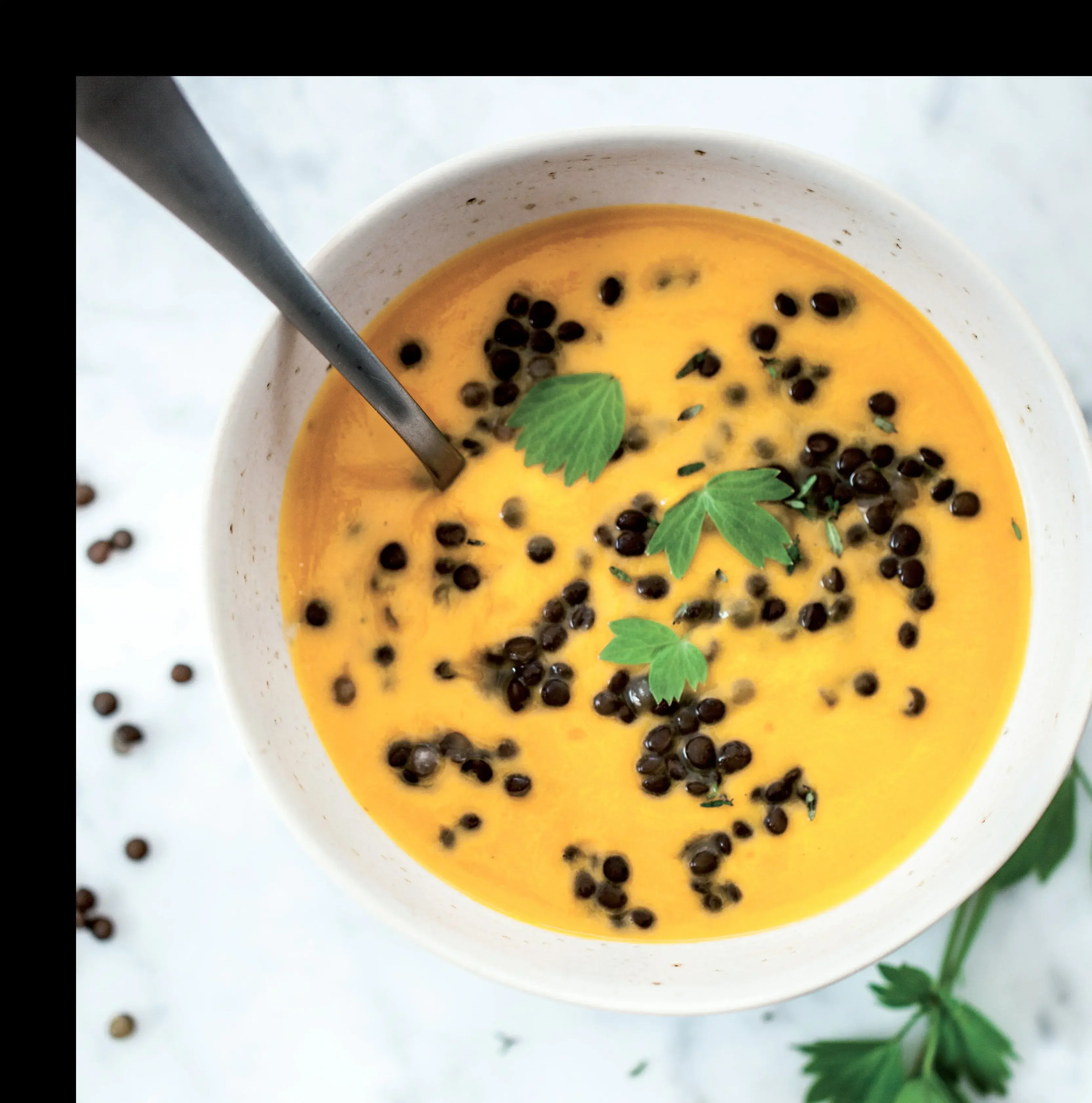 3 Hotovou zeleninu a cibulový základ bez bobkového listu a tymiánu rozmixujte spolu s teplým vývarem na hladký krém. Polévku osolte, opepřete, vmíchejte do ní smetanu a už jen krátce povařte. Na závěr přidejte uvařenou a scezenou čočku. Servírujte s čerstvou petrželí, obilnými klíčky nebo například orestovanými oříšky.